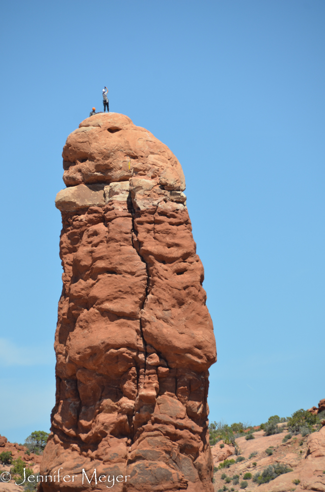 Kate’s eagle eyes spotted climbers on a distance hoodoo, and later, driving back by it, she spotted them again, just as the first climber, a woman, reached the top and stood with her arms outstretched. A man climber was right behind her. I’ve done a little rock-climbing myself, and it looked so exhilarating. I could only imagine what it felt like to stand on top of that huge pillar after such a vigorous climb.