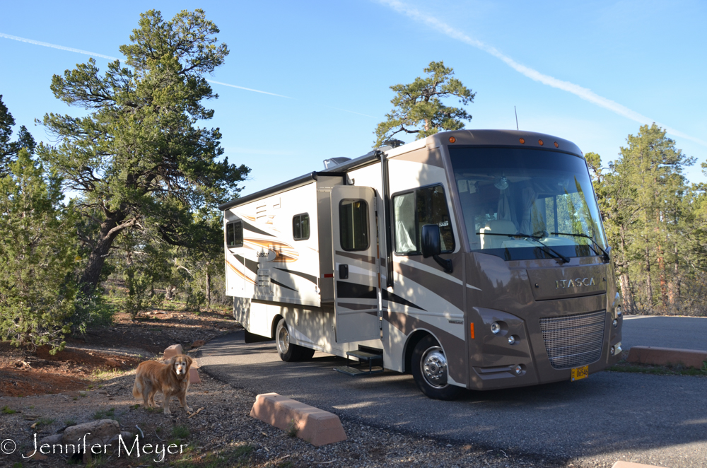 Leaving Bessie in the Visitors Center parking lot, we started up the steep switchback road into the park. We were immediately awestruck. Every direction we looked there were monometal red cliffs, fascinating formations, wildly balanced hoodoos. We were so glad we’d come.