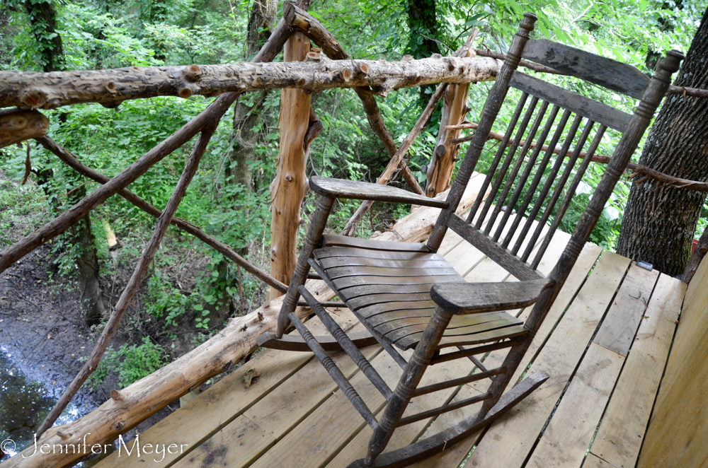 The original treehouse on the property had been booked, but the owners had rented Beth and Don a new treehouse that was not officially open yet. Its construction had been overseen and documented on a TV show called “Treehouse Masters” on Animal Planet (to be aired July 14), and it was pretty much finished, although the air conditioner was having a hard time dealing with the muggy heat (upper 90s). Still, it was a comfortable, nicely done place with a kitchen, bathroom, and loft bedroom. It was high up over a swampy creek with a long ramp winding up to the front door. A leafing tree sprouted up through the living room floor, and the trunk of another leaned into the wall, surrounded by plexiglass. There was a balcony with a rocking chair and a rickety stick railing, and if it hadn’t been so hot and swarming with mosquitoes, it would have been a lovely place to hang out.