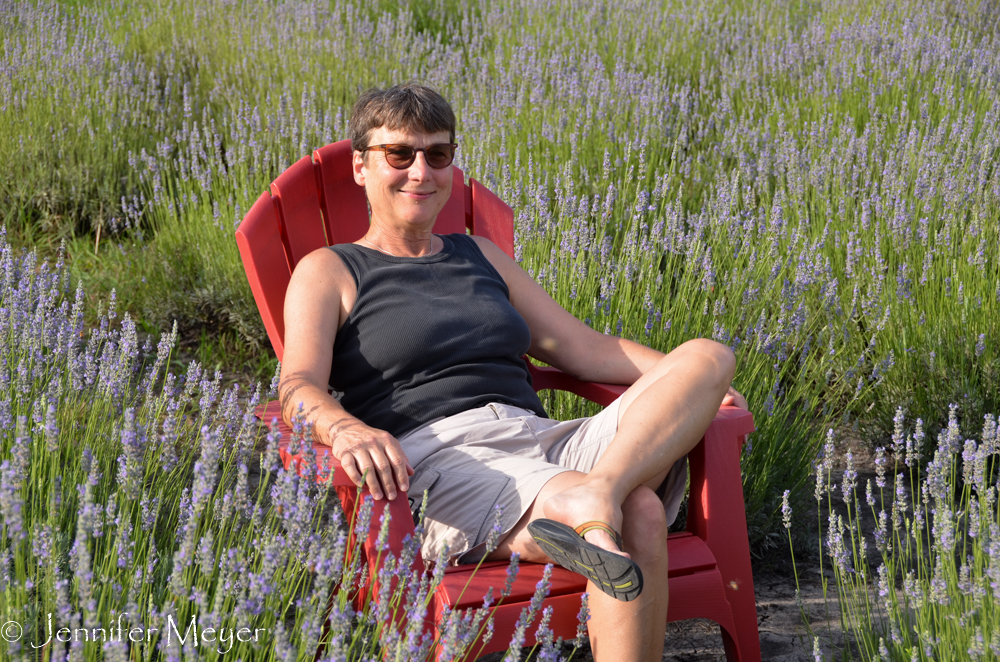 The owners were out boating for the day, so we lathered up with mosquito repellent and tromped around the place, guided by their old basset hound Fred. There were two small fields of blooming lavender, a chicken coop, and duck pond. A silo by the front lavender field contained a little store and there were tables and platforms set up for entertaining. Signs all around the property offered up public areas: herb garden, playground, Zen path, grotto, creek path. And indications of quirky creativity abounded. A birdhouse made from an old cowboy boot. An overstuffed chair hanging from a tree. Outdoor chandeliers. Unfortunately, the place was run down just enough to push quirky over the edge to creepy sometimes.