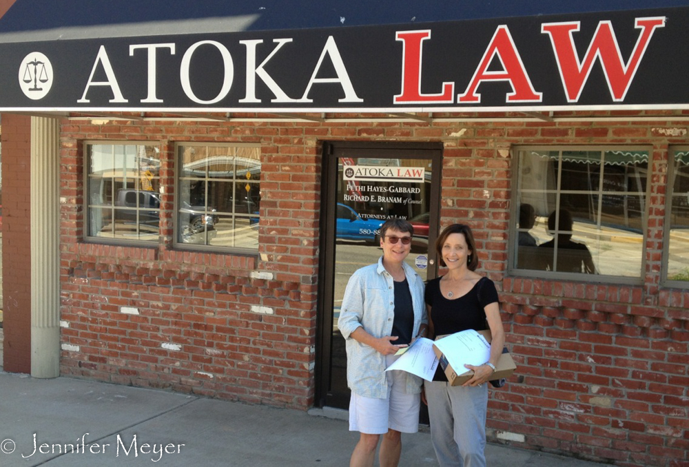 The next morning, we all drove up to Atoka, Oklahoma where we met with a lawyer I’d found on the internet. There were only two, both women, and this one focused on real estate. When I’d called, the receptionist was so casual (“Yeah, sure Tuesday’s fine. When d’you want to come in?”) that I wasn’t sure what to expect. But the law office was the one modern professional building in the whole decaying downtown, and we lucked into a great lawyer.