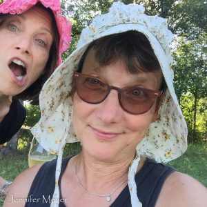 Beth and Don had brought champagne and glasses and had dressed for the event in cowboy boots. Don had a cowboy hat and Beth had two prairie bonnets that she insisted on posing in with me. (She is the only kid to inherit my father’s director genes and if she thought she could get us to do it, she would have had us performing Oklahoma! right there in the field.) We toasted to our ancestors for passing this land along to us, tromped along the border of it, and came back to Bessie crawling with ticks and dripping with sweat.