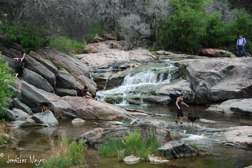 Kate and Marsha arrived soon after with some disappointing news. I’d planned two nights here, thinking Marsha was flying home out of Dallas on Wednesday. But on the drive over, Marsha realized we’d gotten the dates wrong; actually she was flying out Tuesday. Fortunately, we’d gotten in early, so we had all day to enjoy the park. But the weather was coolish with a big storm predicted for the afternoon. So I didn’t bother stringing up hammocks or blowing up the canoe. Instead, Marsha and I went for a hike with Bailey, enjoying wildflowers and cacti and red granite boulders. We headed back when it started raining, but the threatening storm never did arrive. I washed Bailey, and we set up chairs to relax and enjoy our peaceful setting.