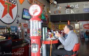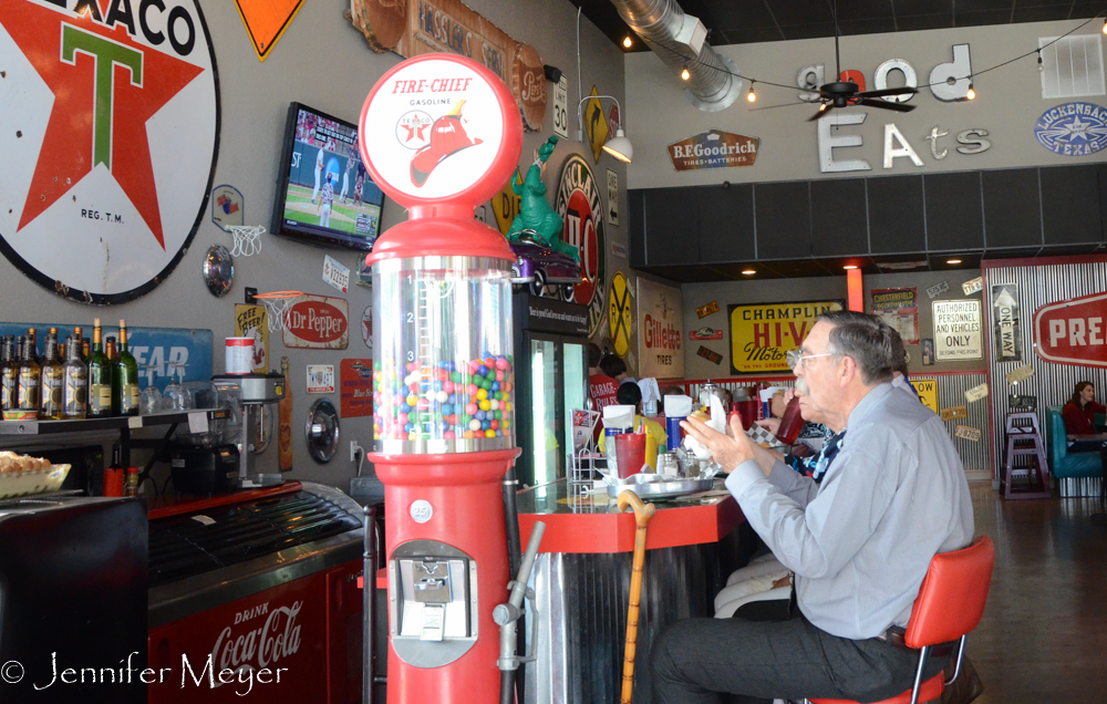 For lunch, we found a popular downtown diner (without bikers) called Jake’s Texas Teahouse. It had a 1960s garage theme, filled with shiny cars (or partial cars), old gas pumps and rusty signs. We shared a huge country fried steak and soaked up the local atmosphere.