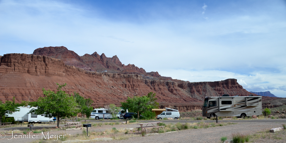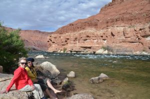 Just a couple of hours northeast of the Grand Canyon’s south rim (and near to the turn-off for the north rim) is a small no-reservation campground called Lee’s Ferry. There are no hookups or showers, but it’s only $12 a night and offers a dramatic backdrop of vermillion cliffs. It’s also on the Colorado River and in the summer is a popular put-in for rafters. But in May, it was very quiet – only 10 or so other campers. And after the crowds and close-in camping of the Grand Canyon, it was exactly the breath of fresh air we needed.
