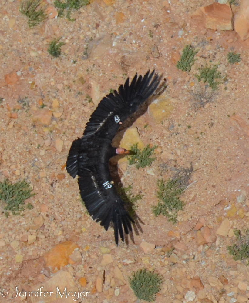 The next morning, on our way out, we stopped again at the Navajo Bridge for a little more condor watching. The same two we’d seen the night before (tagged H9 and 2) were there, as well as a third, tagged 56.